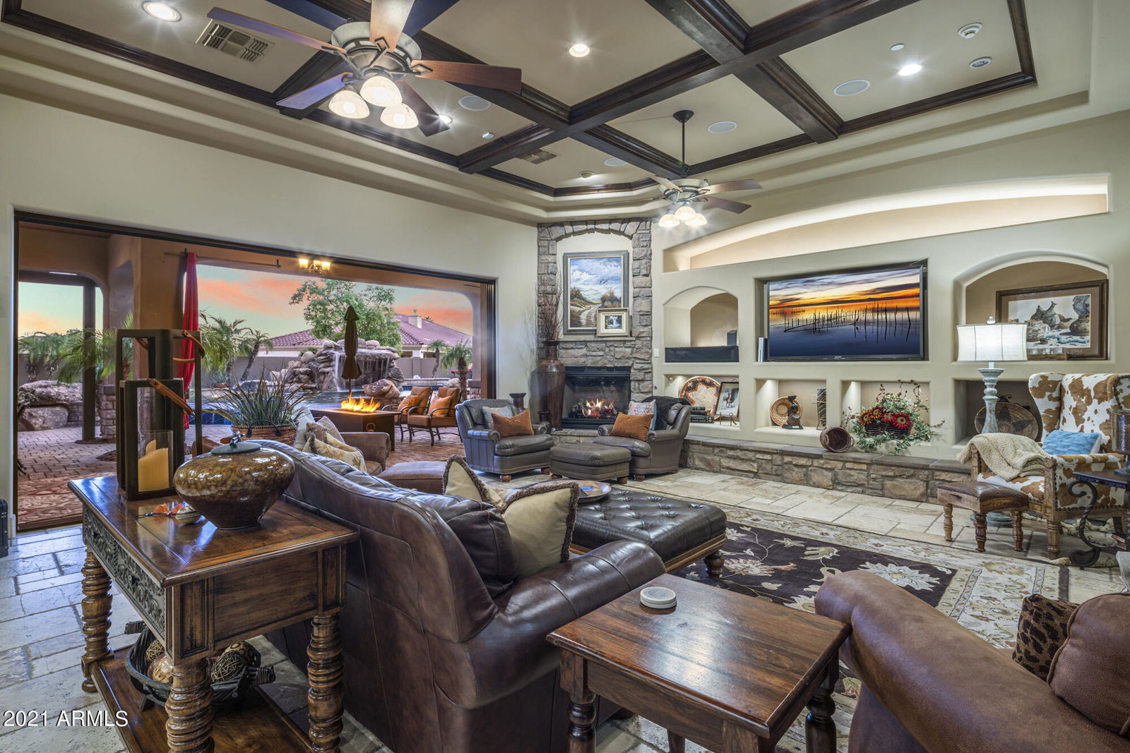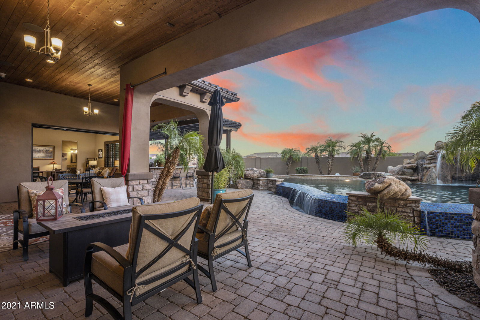 This elegant custom home in the gated community of Russell Ranch in Litchfield Park offers unobstructed Mountain Views! Enter through an impressive foyer with a rotunda circling a custom chandelier & mosaic floor medallion. Luxury features include double tray ceilings, crown molding, travertine flooring, high-end fans/lighting, rich Alder wood cabinetry throughout, plantation shutters & upgraded hardware and finishes, plus 3 gas fireplaces. Beautiful architecture featuring boxed beamed ceiling design in Great Room with built-in entertainment center, gas fireplace and moving glass wall system creating the perfect Arizona outdoor living. The covered patio has tongue & groove ceiling, upgraded lighting, surround sound and misting system.. A spectacular custom rock formation highlights an enclave waterfall, Negative Edge heated Pebble Tec Pool & 12-person Spa. Lovely blue porcelain tiles enhance the negative edge as water flows gently into the surrounding grotto. Entertain guests in the pergola covered Outdoor Kitchen with Grand Turbo gas grill, 21-feet of bar seating, nearby patio dining and raised gas fireplace. It's a chef's delight in the Gourmet Kitchen with top-of-the-line Monogram appliances: Sub-Zero refrigerator, commercial grade gas top with griddle & double convection ovens, large Island with bar seating, granite counters/backsplash, dove-tail/soft close Alder cabinets, walk-in pantry, and Casual Dining Area. The Formal Dining Room is perfect with a wall of cabinets, wet bar and two wine coolers. The Master Retreat creates a cozy hideaway with private exit to back patio ~ Resort style Bath amenities include Walk-In Shower with travertine tile surround, five body spray features plus a rain shower & bench seating. Jetted Tub with romantic 2-way fireplace, high-end cabinetry, lighting, and finishes. Massive Walk-In closet with custom cabinetry and personal washer/dryer! Three additional spacious ensuite bedrooms with walk-in closets. The 4th bedroom is perfect for office/den with moving glass wall feature and full bath with separate exit to patio area. This unique home also offers a private Home Theatre and RV Garage with storage and workbench. Attractive paver driveway, walkways and breezeway with the professionally designed landscaping and exclusive exterior lighting system complete this exquisite estate.